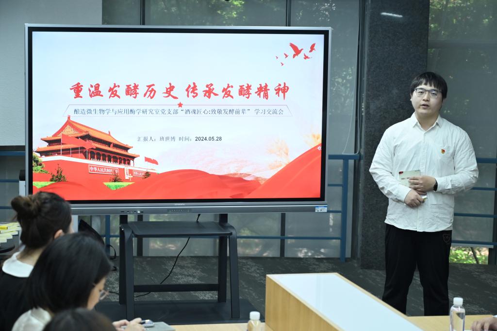 酒科技馆举办,旨在带领师生沉浸式体悟发酵之光、学科力量。通过回顾第106期朱宝镛大讲堂暨中国酿酒大师访谈会现场,引出“致敬发酵前辈 吾辈勇担使命”的交流话题。党支部成员、2021级博士生班世博以“重温发酵历史 传承发酵精神”为主题展开分享,讲述中引经据典,带领师生重温那段峥嵘岁月,结合科研实际,他提到“发酵工程领域的前辈们引领发酵学科前进,作为行业后辈,当以前辈为榜样,站在巨人的肩膀上发奋图强。”
