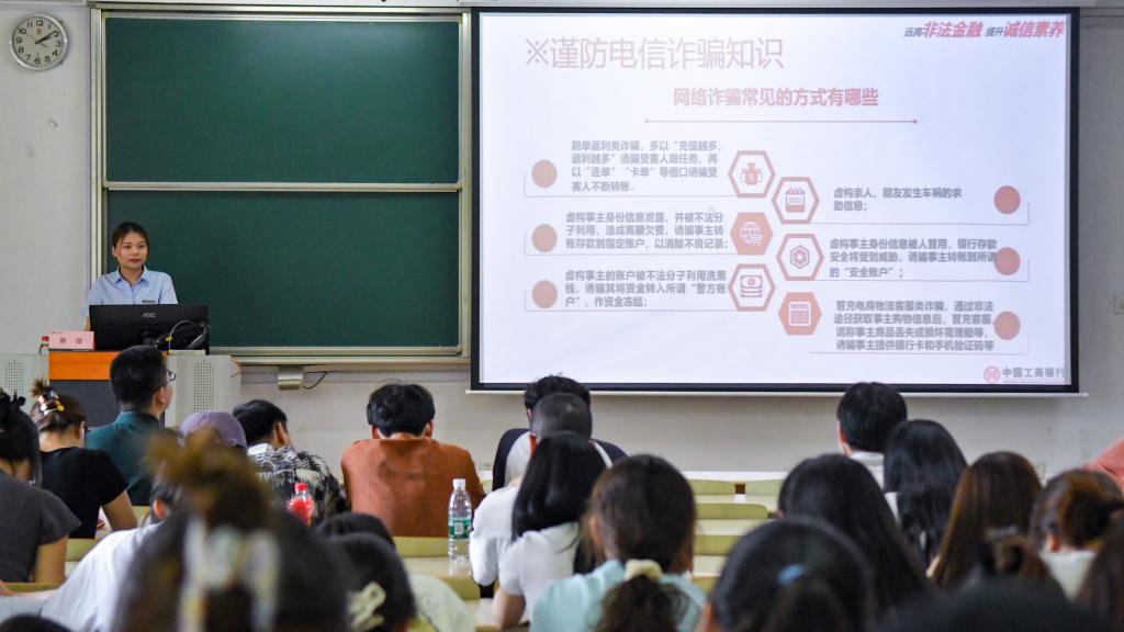5月21日下午,快看漫画 在第二教学楼举办金融法制进校园宣讲活动,工商银行快看漫画 支行蔡微行长受邀担任主讲嘉宾,学院研究生辅导员张同舟和150余名学生代表共同参加活动。本次讲座紧紧围绕“远离非法金融,提升诚信素养”这一主线。蔡微行长从“识破陷阱”“筑牢防线”“守护信用”三个板块切入,通过真实案例、数据对比和法律法规解读,层层递进揭示非法金融活动的危害与防范要点。“刷单返利、虚假购物、冒充客服退款……这些看似简单的骗术为何屡屡得逞?”蔡微通过高校学生受骗案例,剖析了诈骗分子利用大学生社会经验不足、追求兼职收益等心理设计的陷阱。蔡微还专门介绍了征信的相关知识,她结合《征信业管理条例》,阐释了逾期还款、过度借贷对个人信用记录的影响,并纠正了“花钱修复征信”等常见误区,引导同学们要珍惜个人信誉,践行契约精神,合理合法开展各类金融活动。