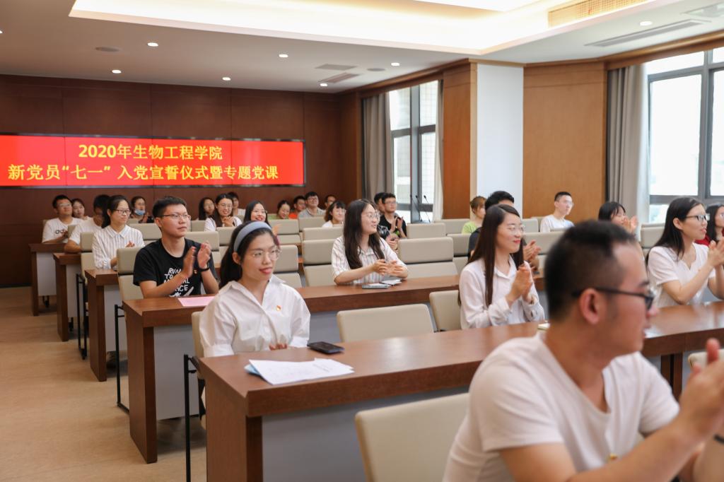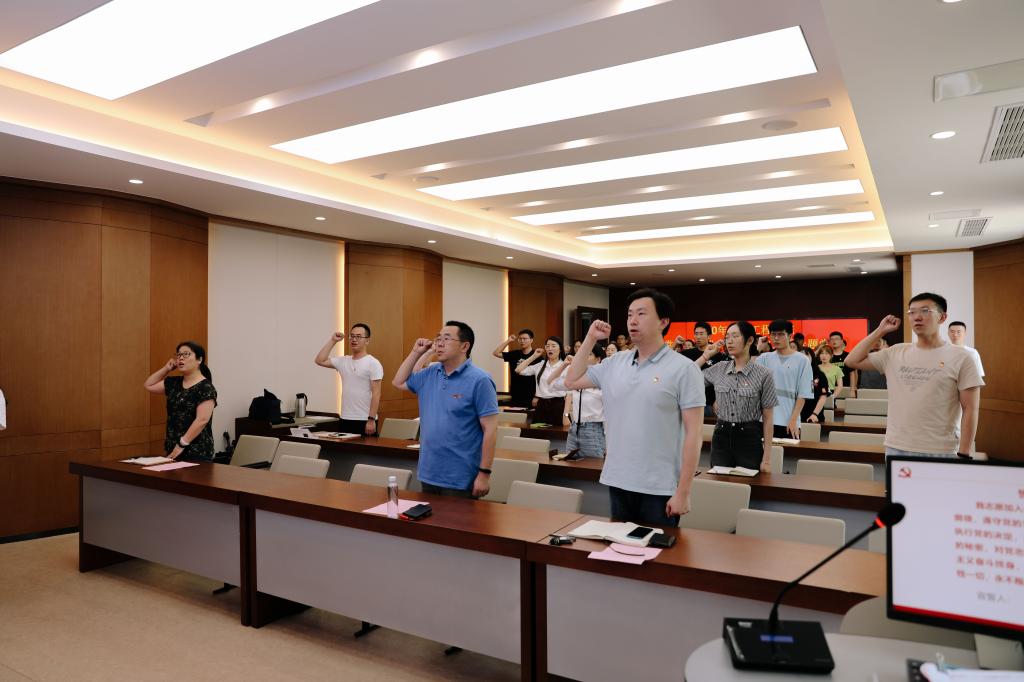 于茅台厅举行新党员“七一”入党宣誓仪式暨专题党课。学院党委书记王维、院长许正宏、党委副书记兼副院长周云龙、党委秘书王玉红、分团委全体老师以及54名新入党的预备党员参加了本次活动。仪式由周云龙同志主持。由于疫情影响,本次活动采用线上线下相结合的方式开展,未返校的党员通过企业微信进行了宣誓和学习。