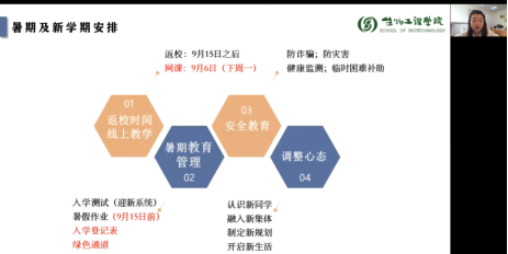 人才培养方案、学籍管理、课程修读和教务管理系统的使用,并分享了《本科生学习指导手册》,指出同学们即将在网上迎来充实忙碌的新学期,希望同学们调整作息,准时上课,完成相应的学业任务。辅导员韩俊就新生暑期教育管理及学校新学期开学安排进行了梳理,并对学生进行了安全教育,提醒同学们防范电信诈骗,注意人身安全,加强自我健康监测和体育锻炼。同时鼓励同学们及时调整假期状态,积极结交新同学、融入新集体、制定新规划,收获充实而灿烂的大学生活。