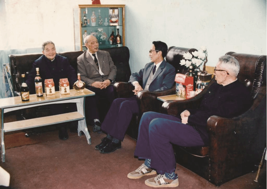 檀耀辉(右一)、朱宝镛(左一)、王鸿祺(左二)等发酵学科资深教授与发酵系主任伦世仪讨论学科发展,1984