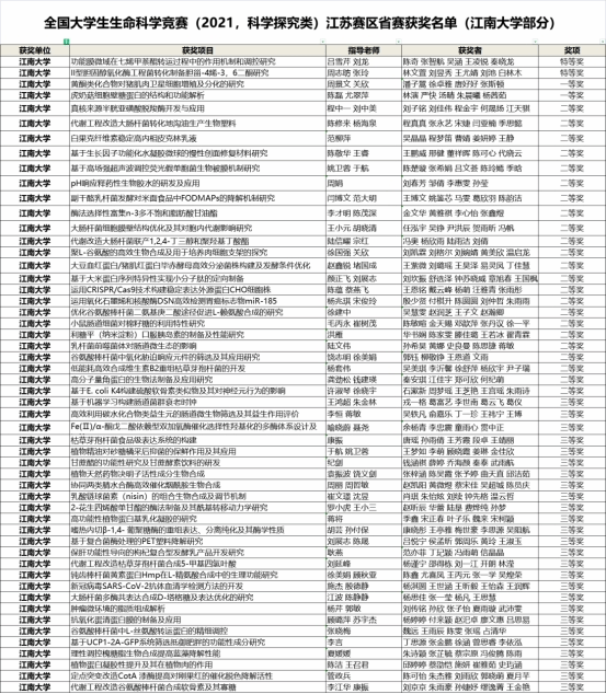 近日,全国大学生生命科学竞赛(2021,科学探究类)江苏赛区省赛获奖名单公布。本次赛事共设特等奖5项,一等奖11项,二等奖43项,三等奖65项,本校生工、食品、药学三个学院共53个学生项目参赛,各个参赛团队发挥出色,喜获佳绩,斩获特等奖2项,一等奖2项,二等奖23项,三等奖26项。