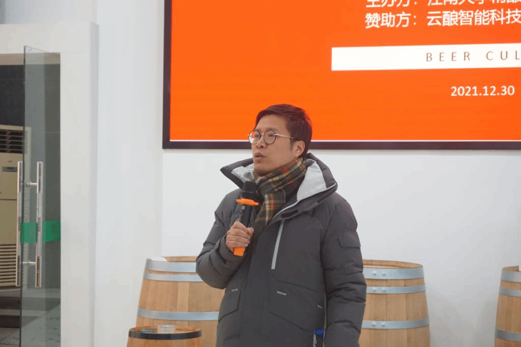 是中国酿酒工程师的摇篮,同学们要传承老一辈酿酒大师的发酵精神,身体力行“勇于创新、善于实践”的精神。周书记一番话鼓舞了所有在场人的信心。随后,精酿俱乐部主席郜子航给大家汇报了本学期的工作并做出了来年展望。过年的一年中,俱乐部同学们完成了啤酒车间的装饰美化,进行了丰富而充满趣味的果啤酿造比赛与品鉴活动,俱乐部黑天鹅拉格和红色艾尔两支作品参加了2021CBC中国国际啤酒挑战赛,并最终获得天禄奖一星的好成绩。俱乐部指导老师及品酒部同学为同学们自酿的果啤产品进行了品鉴,并为果啤酿造比赛中表现优秀的同学颁奖,以资鼓励。展望未来,俱乐部将继续定期开展酿酒及品酒活动,继续参加国内外啤酒相关赛事,进一步拓展与国内酿酒专业兄弟高校的交流与合作。