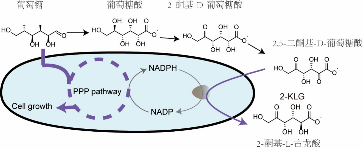 由于过于活跃的化学性质,维生素C无法长期稳定存在于复杂的液体环境中。因此,工业上都是以合成其前体物质2-酮基-L-古龙酸来实现维生素C的大规模生产。周景文告诉记者,目前,2-酮基-L-古龙酸的主要生产方式为三菌两步法,虽然转化率高,但高能耗带来的问题始终是困扰企业的主要难题,如何通过一种细菌一步发酵直接实现2-酮基-L古龙酸的生产一直是困扰维生素C产业的关键问题。于是,团队以氧化葡萄糖酸杆菌为底盘菌株,从山梨醇和葡萄糖两条合成途径同时着手,开发出维生素C单菌一步发酵工艺。
