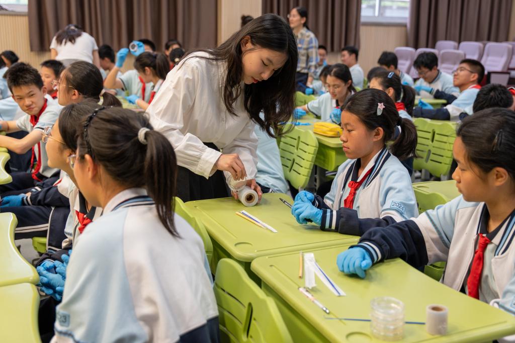 科普·用创新勾勒青春。4月11日下午,学院iGEM团队Jiangnan-China走进无锡市辅成实验学校,带领生物社团成员及入团积极分子开启一场“微生物的探秘之旅”。活动中,iGEM成员讲述了常见细菌在日常生活的作用,介绍了合成生物学的发展与应用,以及重要工具荧光蛋白的标记和示踪功能。此外,指导同学们以“细菌”为“墨”,以“培养基”为“纸”,尽情发挥自己的巧思创意。这场跨越高校与中学的知识接力,通过理论讲授、实验操作、艺术创作多维互动等形式,在青少年心中播撒下生命科学的火种。