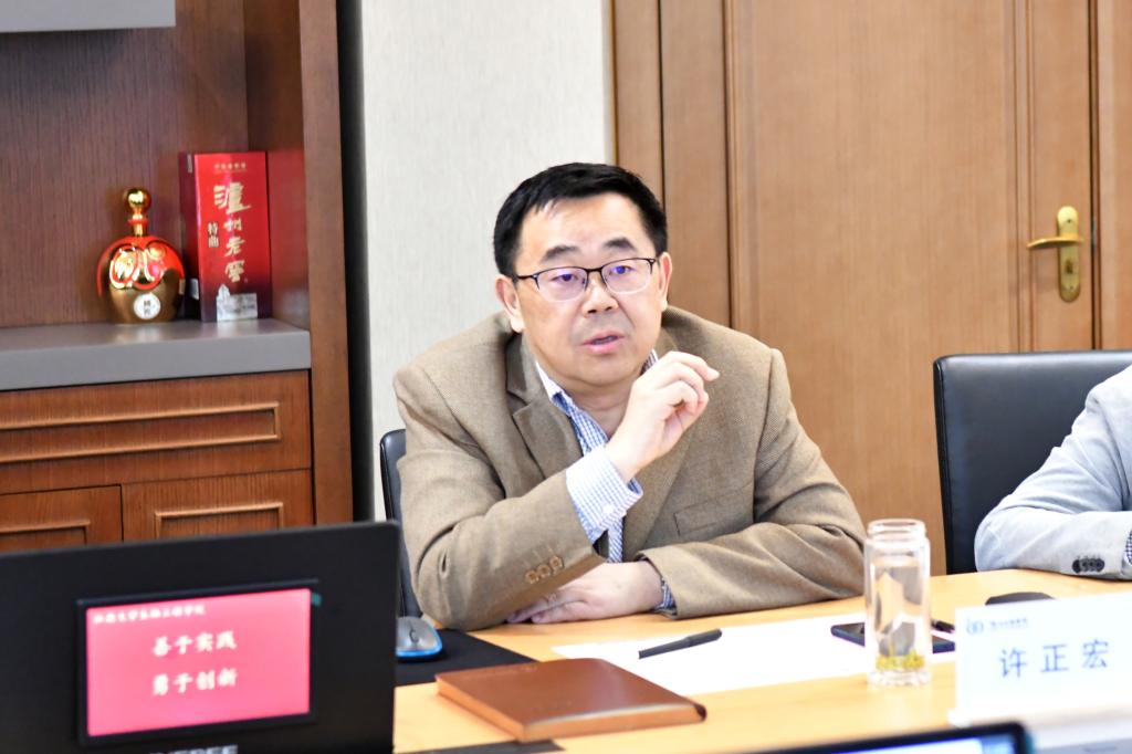 许正宏院长对王雷一行的来访表示热烈欢迎。他就学院目前学科发展的布局,以及近年来学院在人才培养、团队管理、文化建设等方面的思路和举措,进行了详细介绍。他提出,以“发酵你的梦想”作为学院口号,凝心聚力,谋大势、带队伍、建能力、开新局。丁重阳副院长从历史沿革、教学科研、社会服务、国际交流等方面介绍了学院的最新进展。