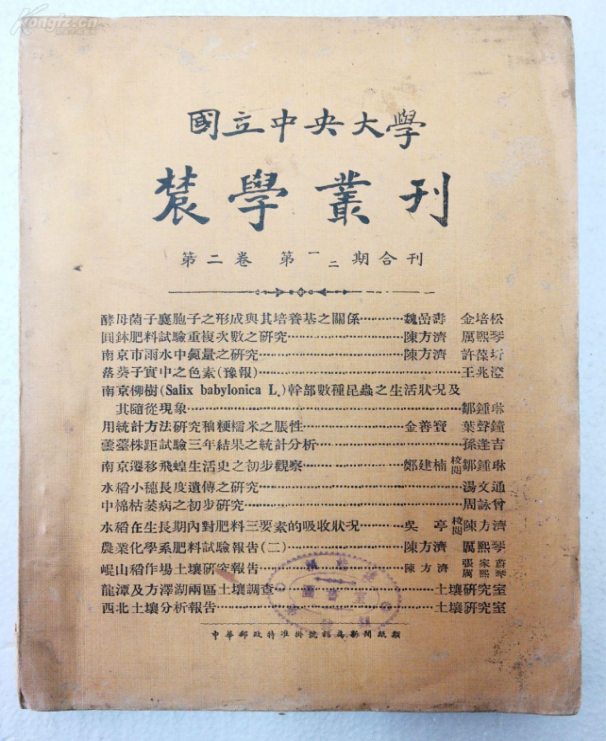 (原国立中央大学《农学丛刊》上刊登的魏喦寿、金培松发表的发酵科学研究论文,1934)