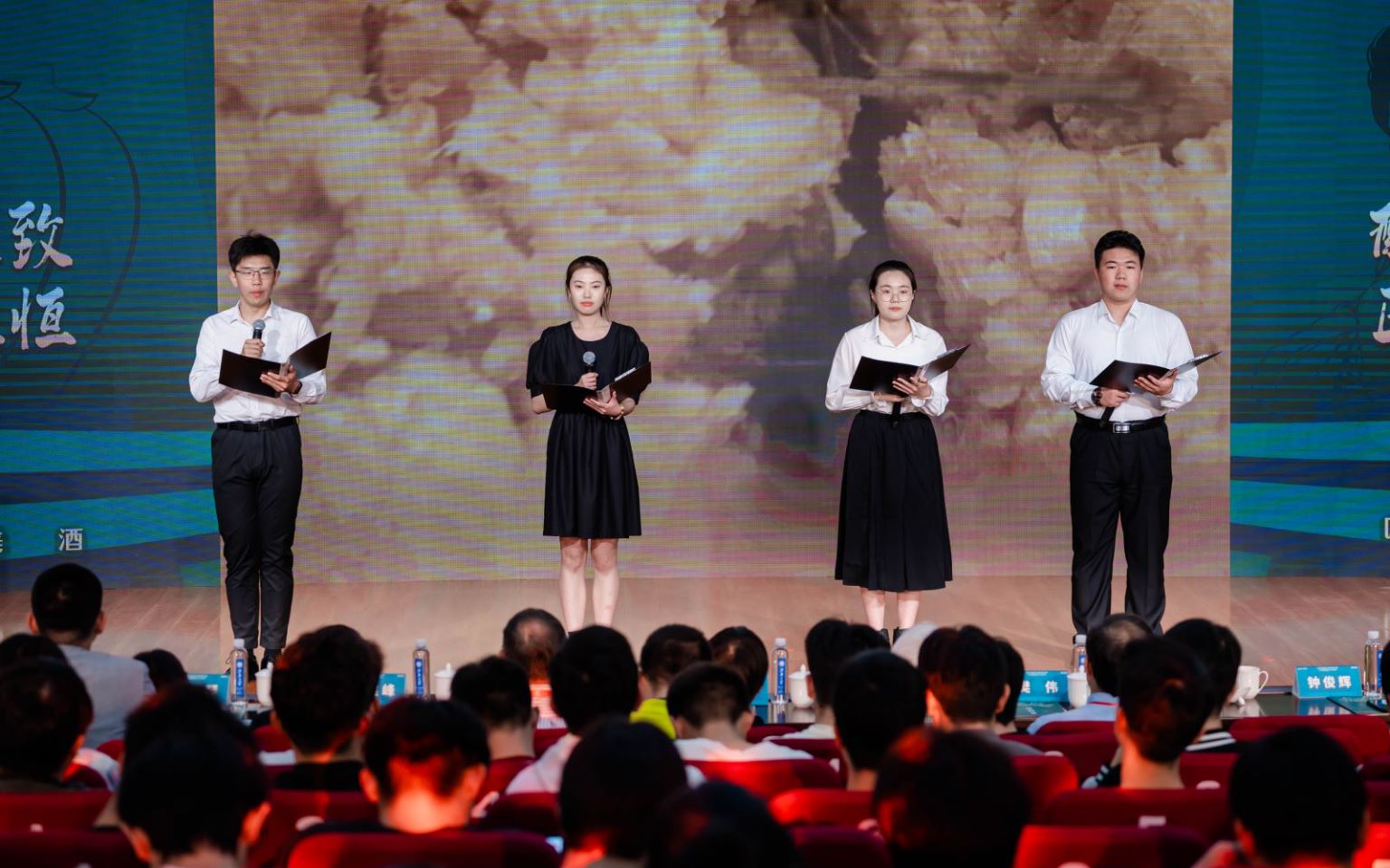 随后,同学们以饱满的热情带来原创诗歌朗诵《酿造极致 匠心永恒》。“用实践打牢酿酒技艺的基石,用传承延续发酵精神的血脉。”朗读者们以诗传情,致敬发酵前辈,歌颂他们以时光和匠心传承经典、重塑经典。站在舞台上,朗读者、酿酒2102班“赤水河”特称团支部成员张一冉表示,学习感悟发酵前辈们筚路蓝缕、以启山林的创业精神,传承弘扬善于实践、勇于创新的发酵精神将成为自己人生道路上宝贵的财富。