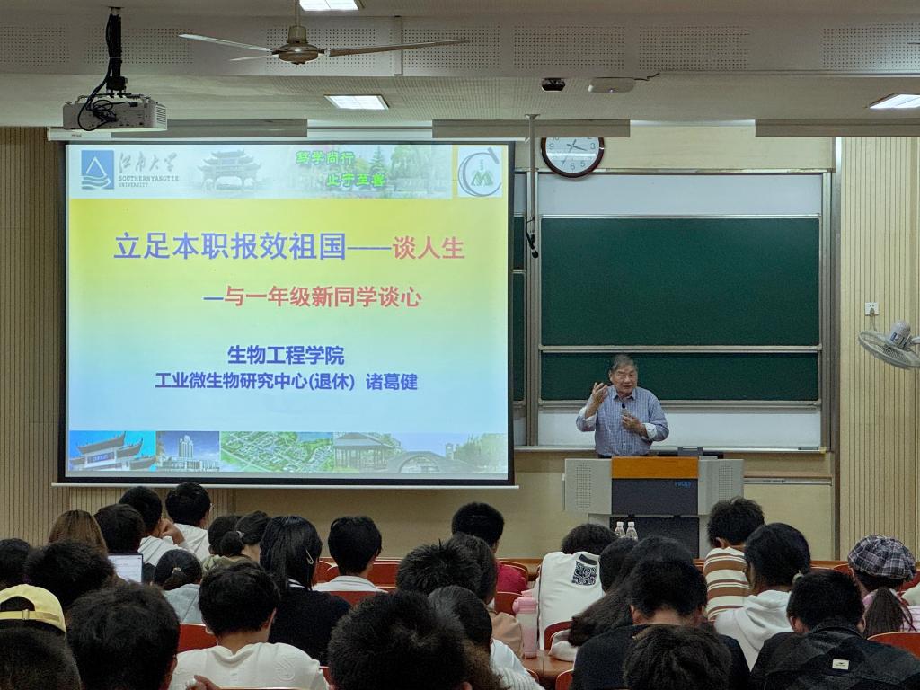 讲座开始,诸葛健教授讲述了他丰富的人生经历,少年时特殊的家境和独特的人生体验塑造了不畏艰苦、敢冒风险、勇于独立的精神品质。并为同学们分享了考入南京工学院食品工业系就读发酵专业和拒绝加拿大移民邀请甘愿奉献祖国这两个人生拐点。诸葛健教授勤学苦读,不畏艰难,热爱祖国,言传身教地教导同学们“学一行干一行爱一行,才有出息。”